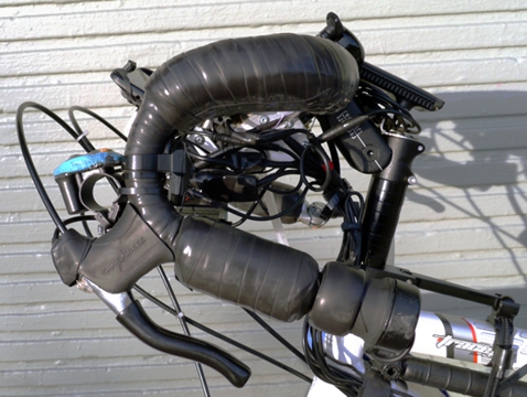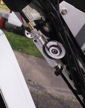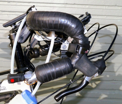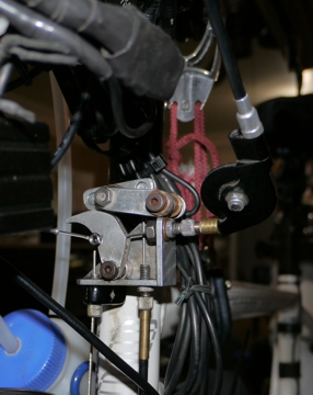 Hose clamp cable stop for rear brake provides proper cable housing angle. Added return spring for correct feel and break action from long travel cable housing.